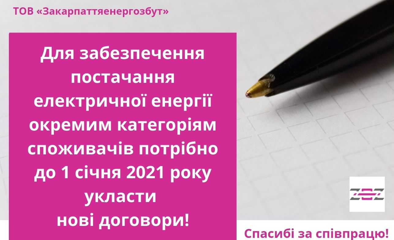 Для забезпечення постачання електричної енергії окремим категоріям споживачів потрібно до 1 січня 2021 року укласти нові договори!