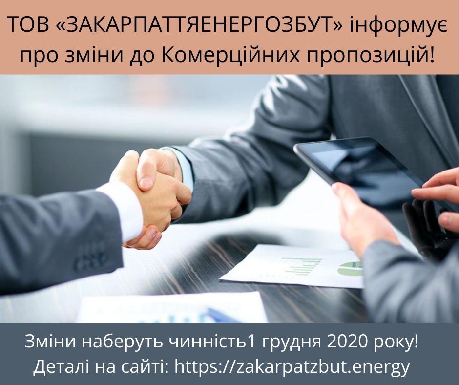 ТОВАРИСТВО З ОБМЕЖЕНОЮ ВІДПОВІДАЛЬНІСТЮ «ЗАКАРПАТТЯЕНЕРГОЗБУТ» інформує про зміни до Комерційних пропозицій, які наберуть чинність з 01 грудня 2020 року