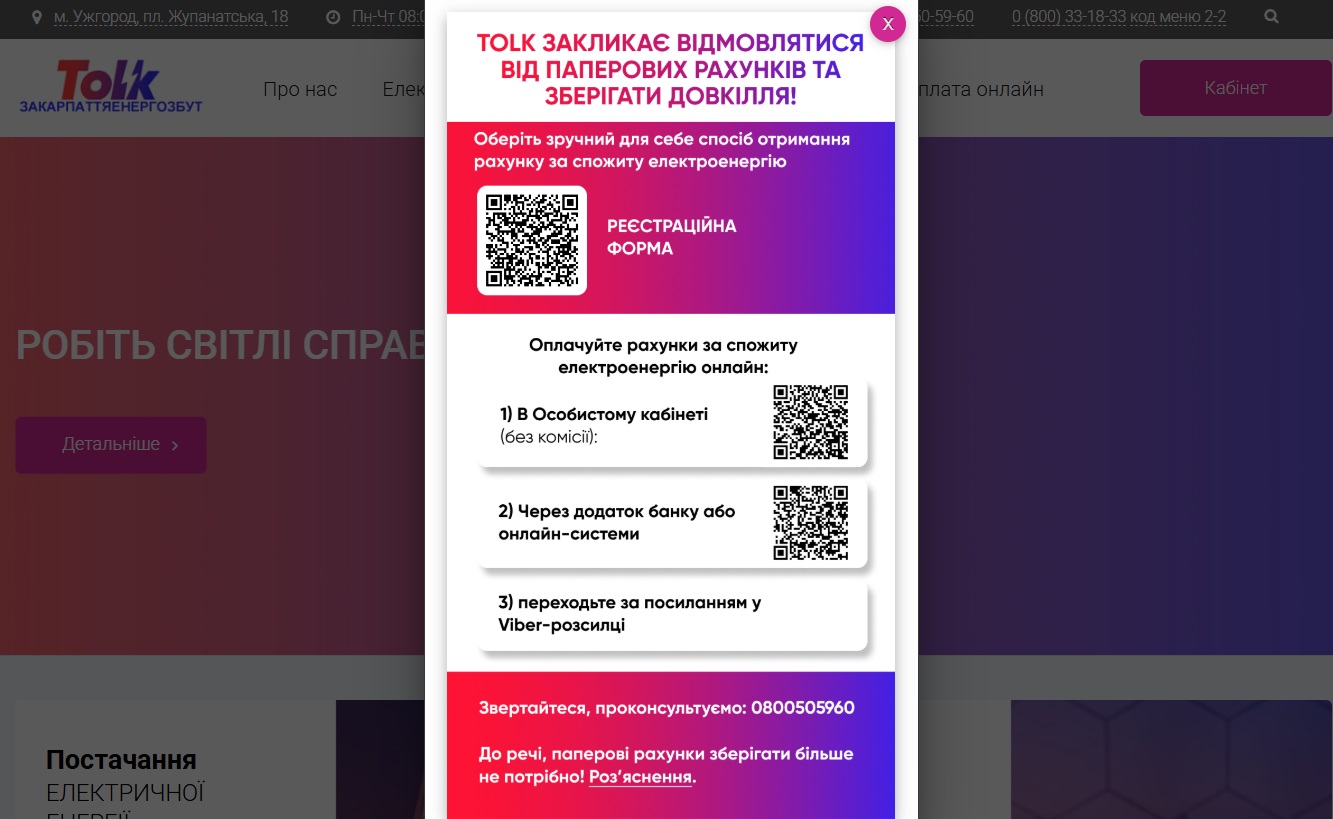 Щоб отримувати в майбутньому рахунки в електронному форматі, потрібно зайти на офіційний сайт ТОВ «Закарпаттяенергозбут» - https://zakarpatzbut.energy/ - й одразу на головній сторінці в спливаючому повідомленні засканувати QP-код чи перейти за клікабельним словосполученням «Заповнити форму».